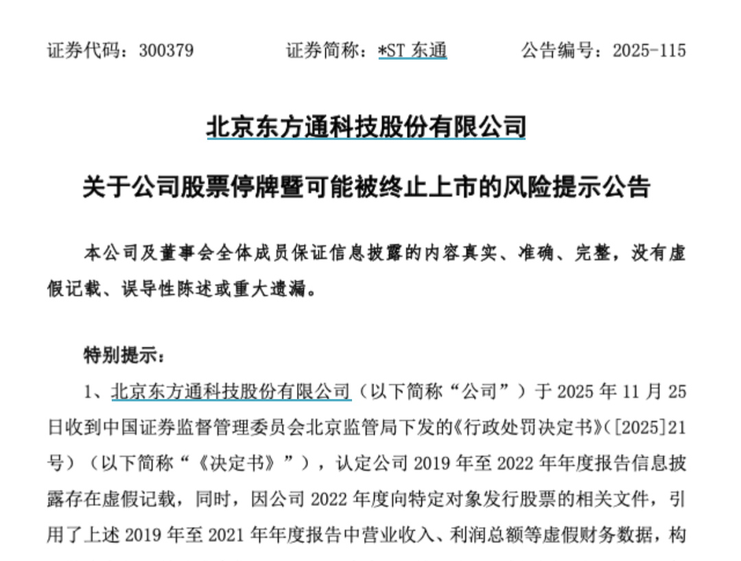 11月25日晚,*ST东通(维权)发布《关于收到行政处罚决定书的公告》及《关于公司股票停牌暨可能被终止上市的风险提示公告》,确认公司因长期系统性财务造假及欺诈发行,收到中国证券监督管理委员会北京监管局《行政处罚决定书》。